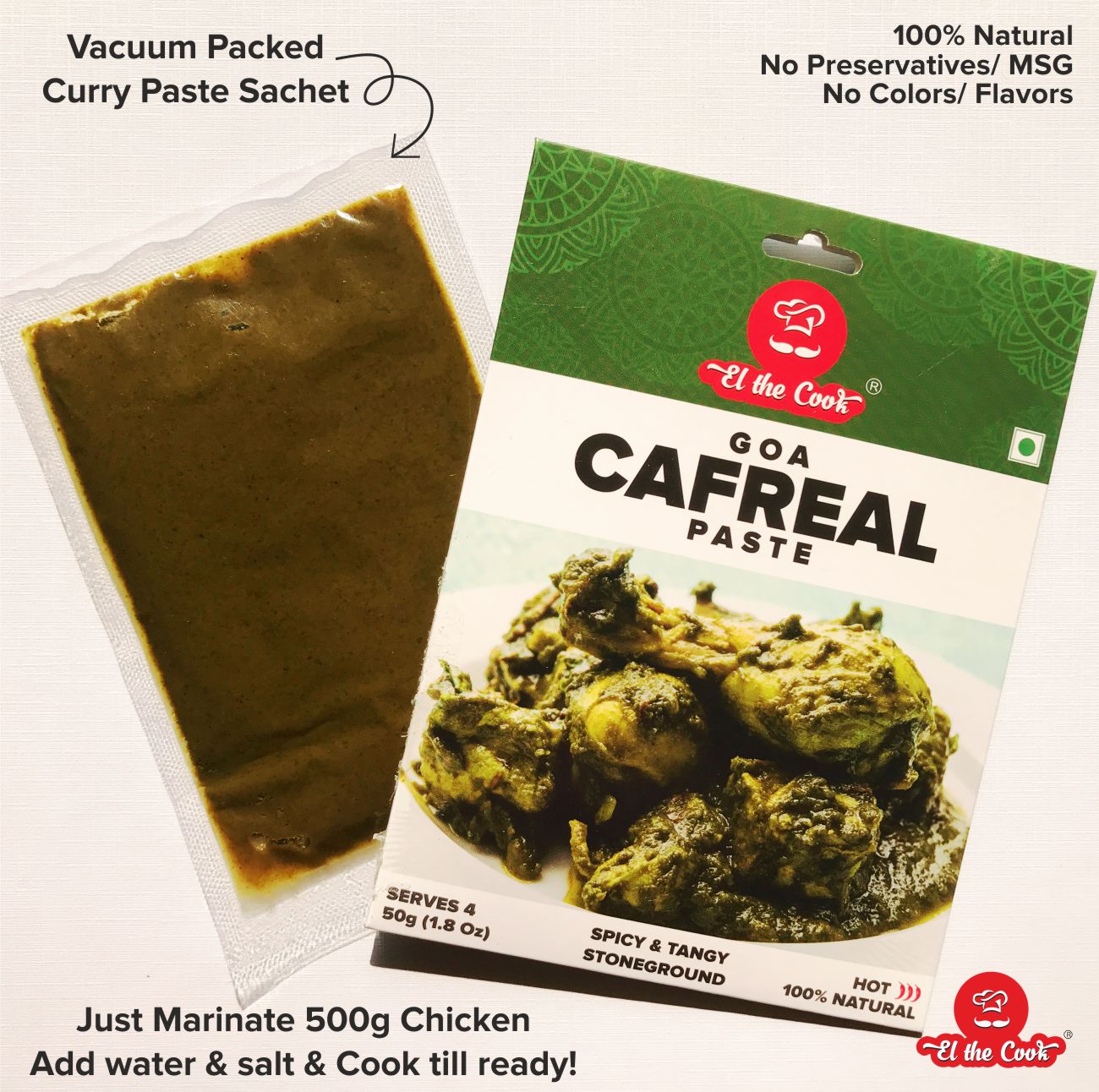 | Ingredients | Goan Coconut Vinegar, Coriander, Green chili, Premium Spices like Black Pepper, Clove, Cinnamon, Cardamom, Ginger, Garlic, Salt, Sugar, Turmeric, Cumin |
